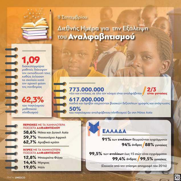 Σύμφωνα με την UNESCO, 750 εκατομμύρια ενήλικες σ' όλο τον κόσμο είναι αναλφάβητοι και περισσότερα από 250 εκατομμύρια παιδιά, κυρίως στις φτωχές χώρες της Ασίας και της Υποσαχάρειας Αφρικής. Στόχος της UNESCO είναι όλα τα παιδιά του κόσμου, αγόρια και κορίτσια, να έχουν πρόσβαση στην πρωτοβάθμια εκπαίδευση.